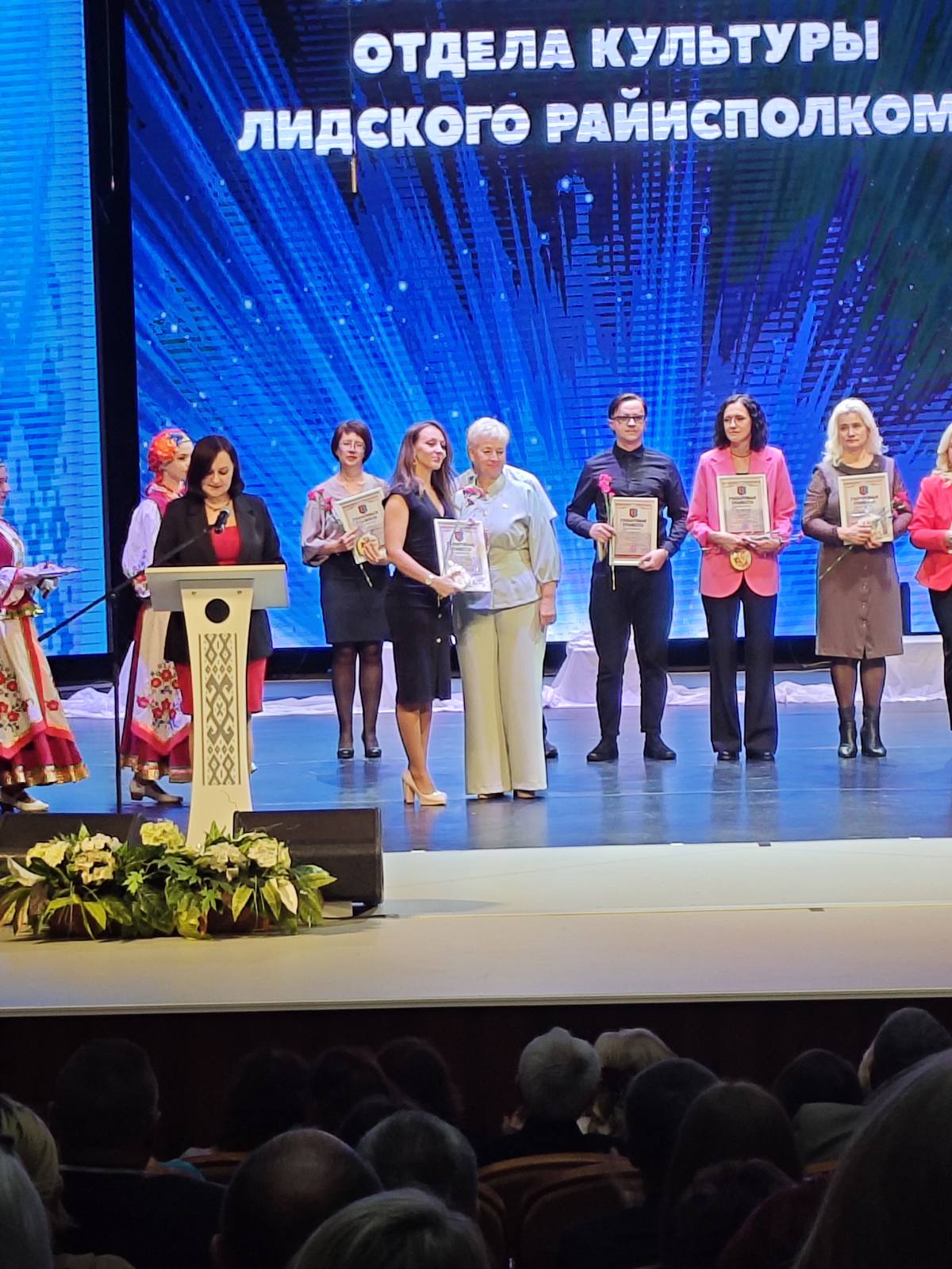 В рамках праздничной программы были отмечены творческие достижения наших коллег: благодарственным письмом председателя Лидского райисполкома награждена директор школы Жилинская Е.И., благодарственным письмом Совета депутатов Лидского райисполкома-учитель теоретических дисциплин Максимович С.И., Почетная грамота отдела культуры Лидского райисполкома вручена Самсоновой А.В.-учителю хоровых дисциплин и Гайко В.В.-учителю по классу фортепиано, грамотой Лидской районной организации белорусского профсоюза работников культуры, информации, спорта и туризма отмечена Кирикова О.В. -председатель профсоюзной организации школы. В торжественной части концерта на сцене приветствовали молодых специалистов школы.