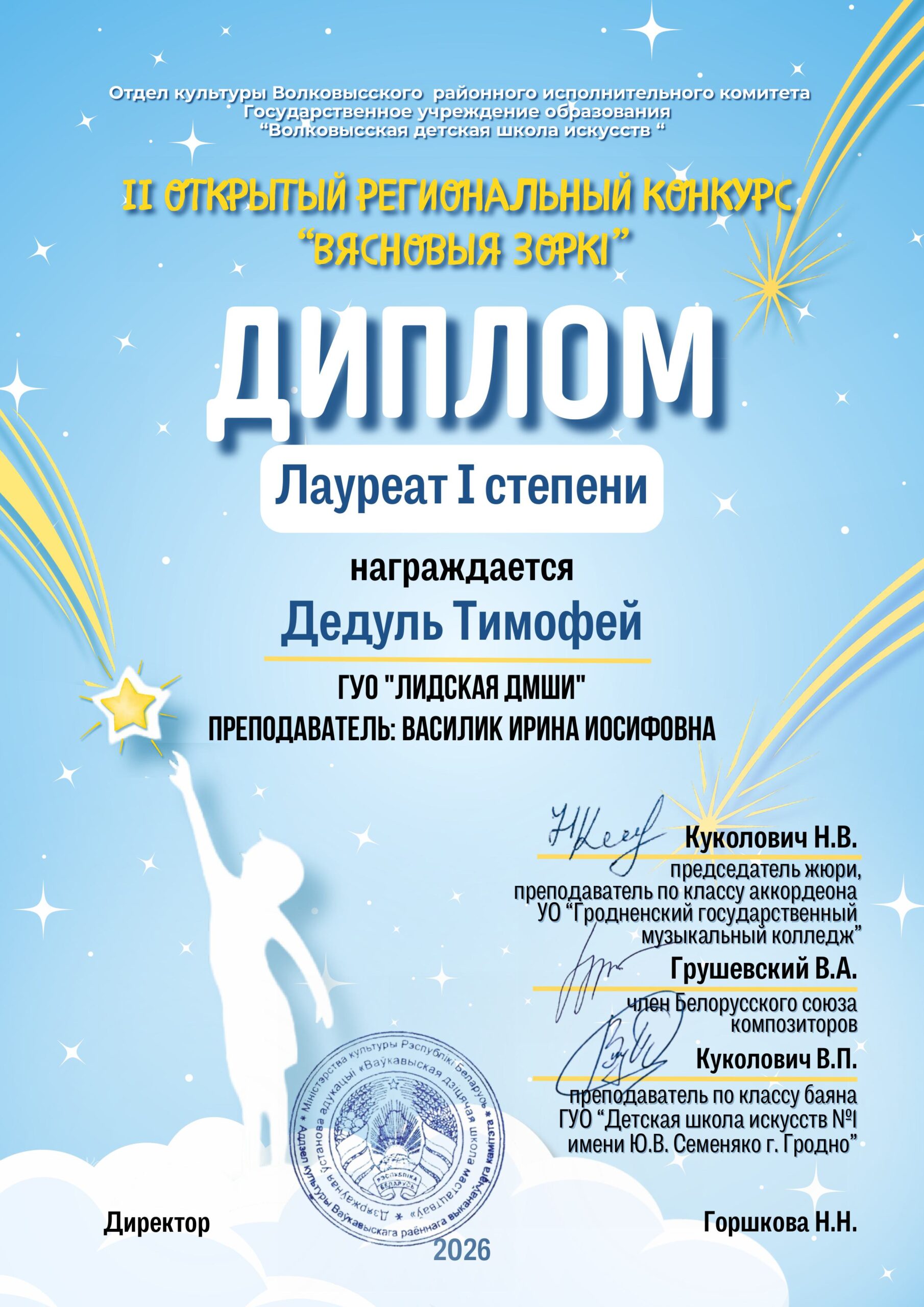 🥇Дедуль Тимофея – диплом лауреата I степени, учитель Василик И.И.
