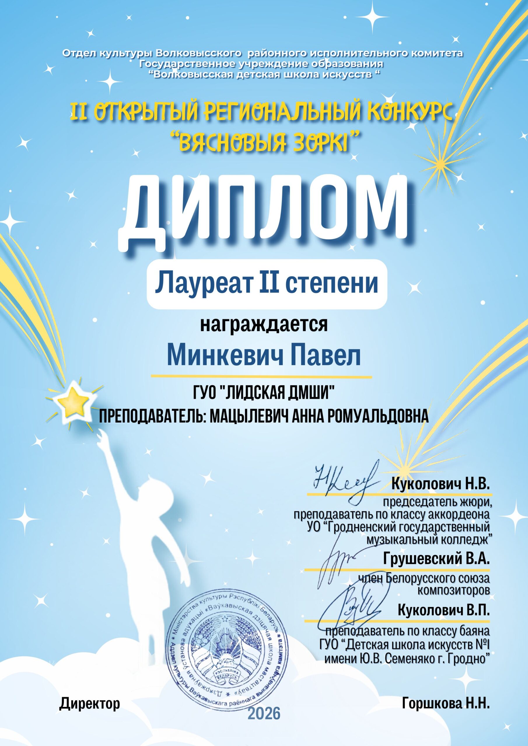 🥈Минкевича Павла – диплом лауреата II степени, учитель Мацылевич А.Р.