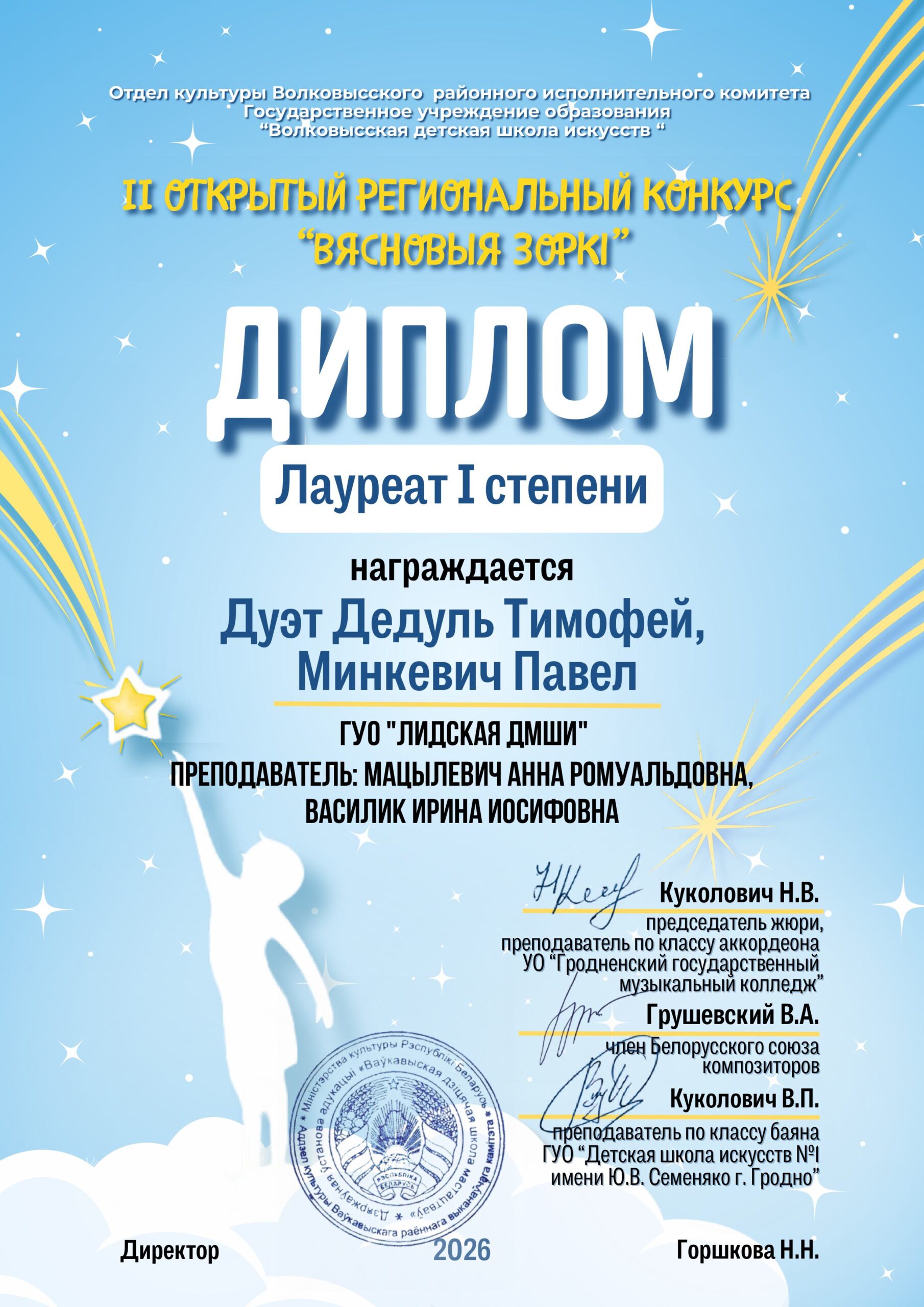 🥇Дуэт Дедуль Тимофея и Минкевича Павла – диплом лауреата I степени, учитель Мацылевич А.Р., Василик И.И.