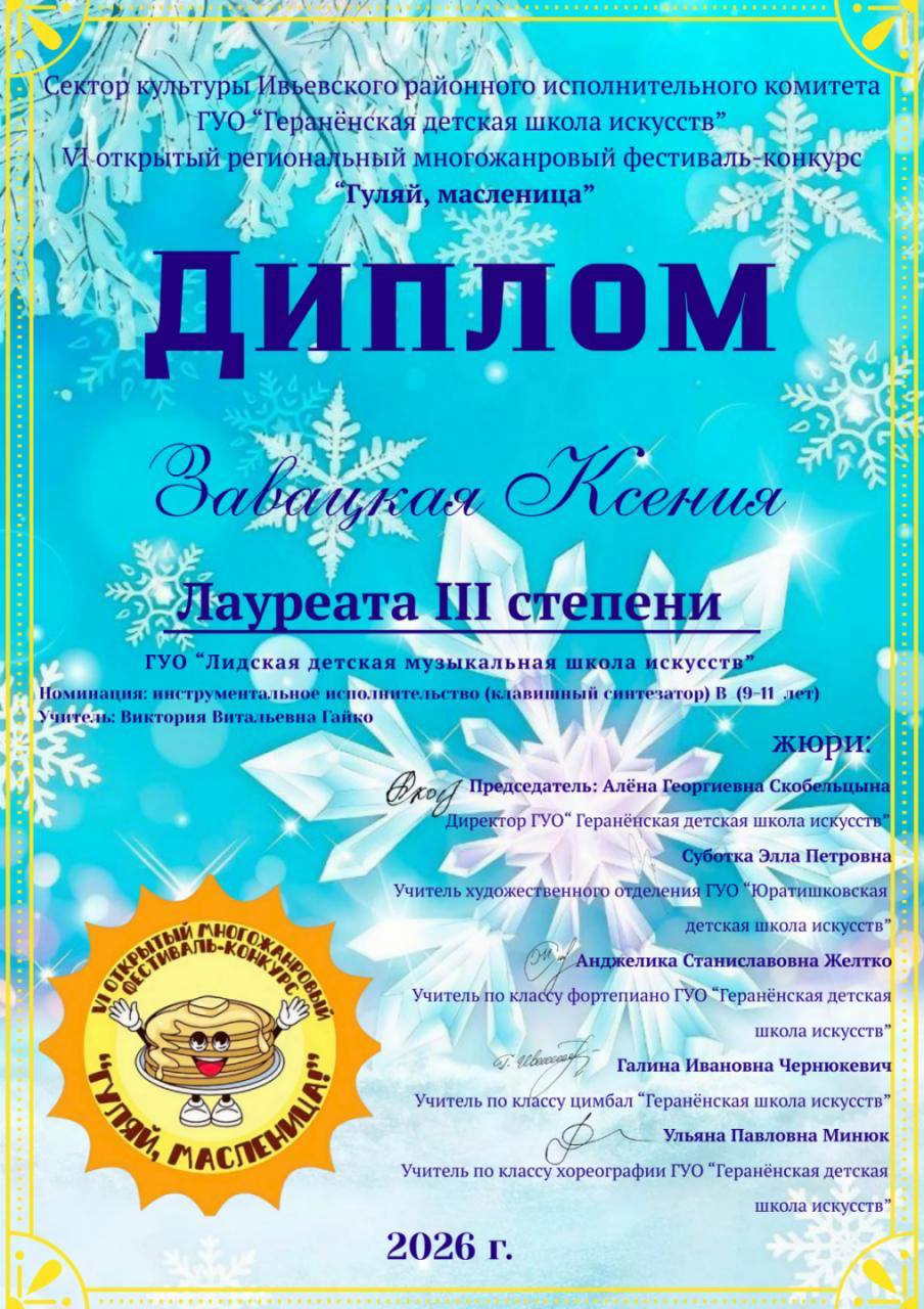 Завацкая Ксения – лауреат ІІІ степени, учитель Гайко В.В.