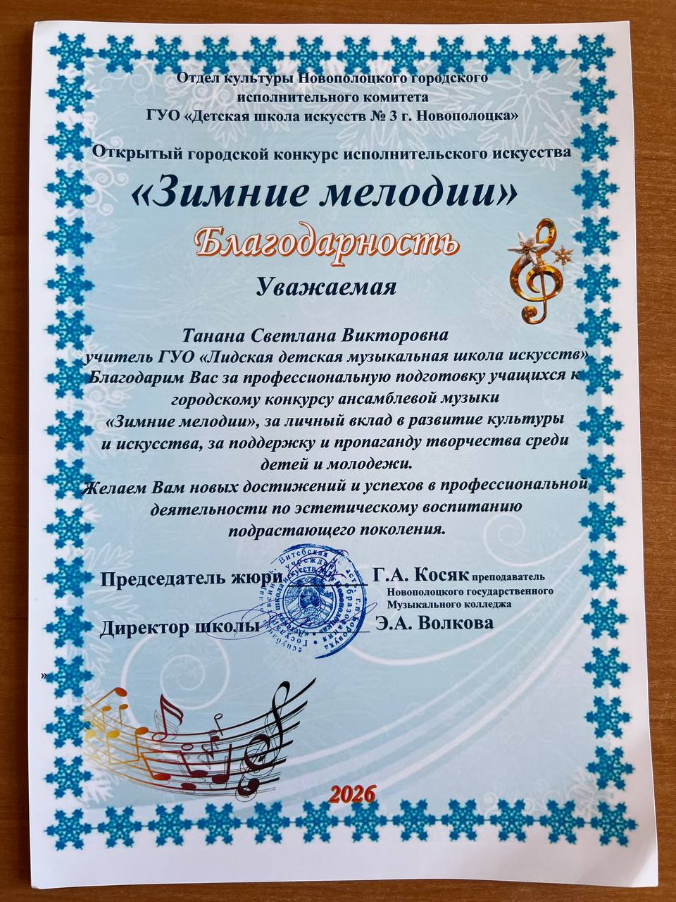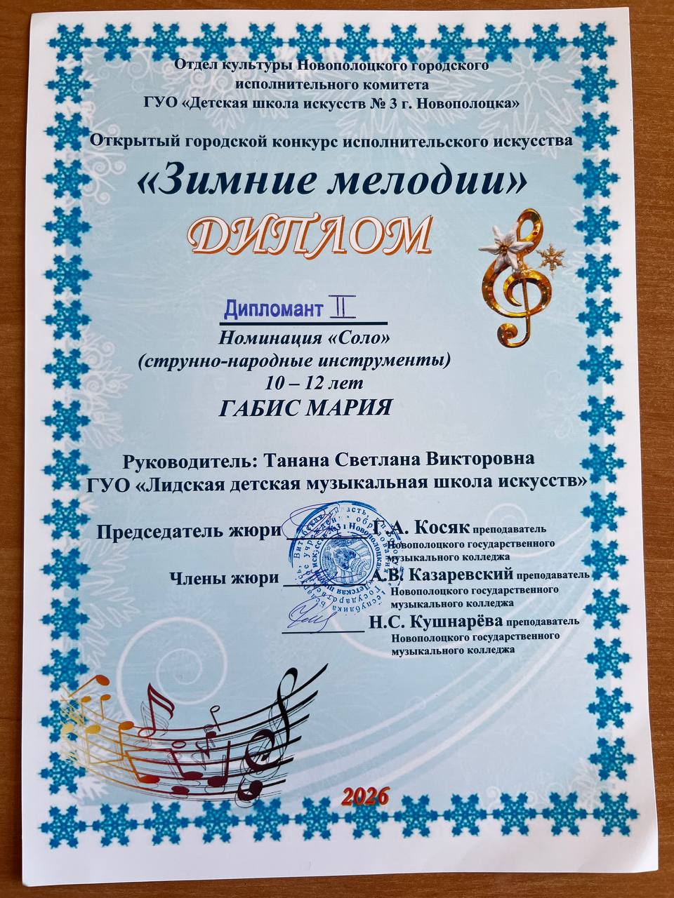 ❄️Поздравляем победителя открытого городского конкурса исполнительского искусства «Зимние мелодии» (г. Новополоцк):