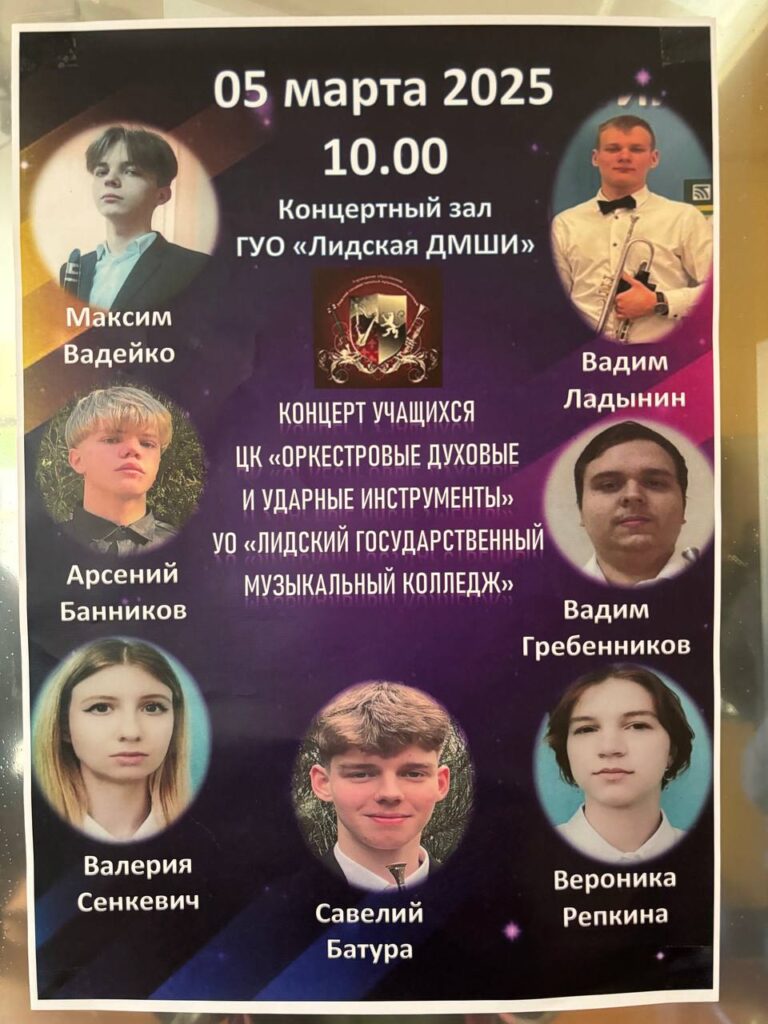 5 марта в школе прошел концерт учащихся ЦК “Оркестровые духовые и ударные инструменты” УО “Лидский государственный музыкальный колледж” в исполнении студентов и учащихся прозвучали произведения зарубежных, русских , советских и современных белорусских композиторов. Навигация по записям конкурс “Весёлые смычки”Концертной программе, посвященной Дню 8 марта “Прекрасной половине человечества посвящается”