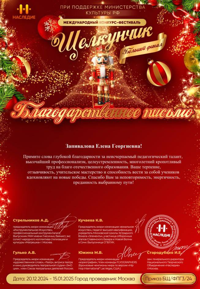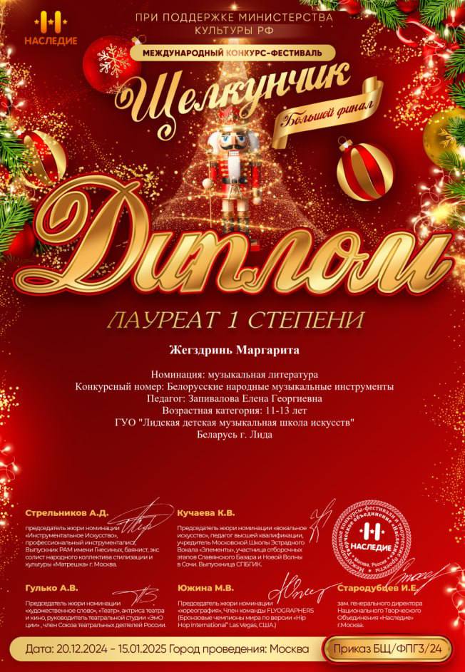 Поздравляем победителей Международного фестиваля – конкурса «Щелкунчик» (Россия) Музыкальная литература Жегздринь Маргарита – диплом лауреата I степени Учитель Запивалова Е.Г. Навигация по записям Поздравляем победителей открытой онлайн олимпиады по музыкально-теоретическим дисциплинам (аг. Гольшаны) Новогоднее представление “Как Дракон Драконыч Новый год спасал”