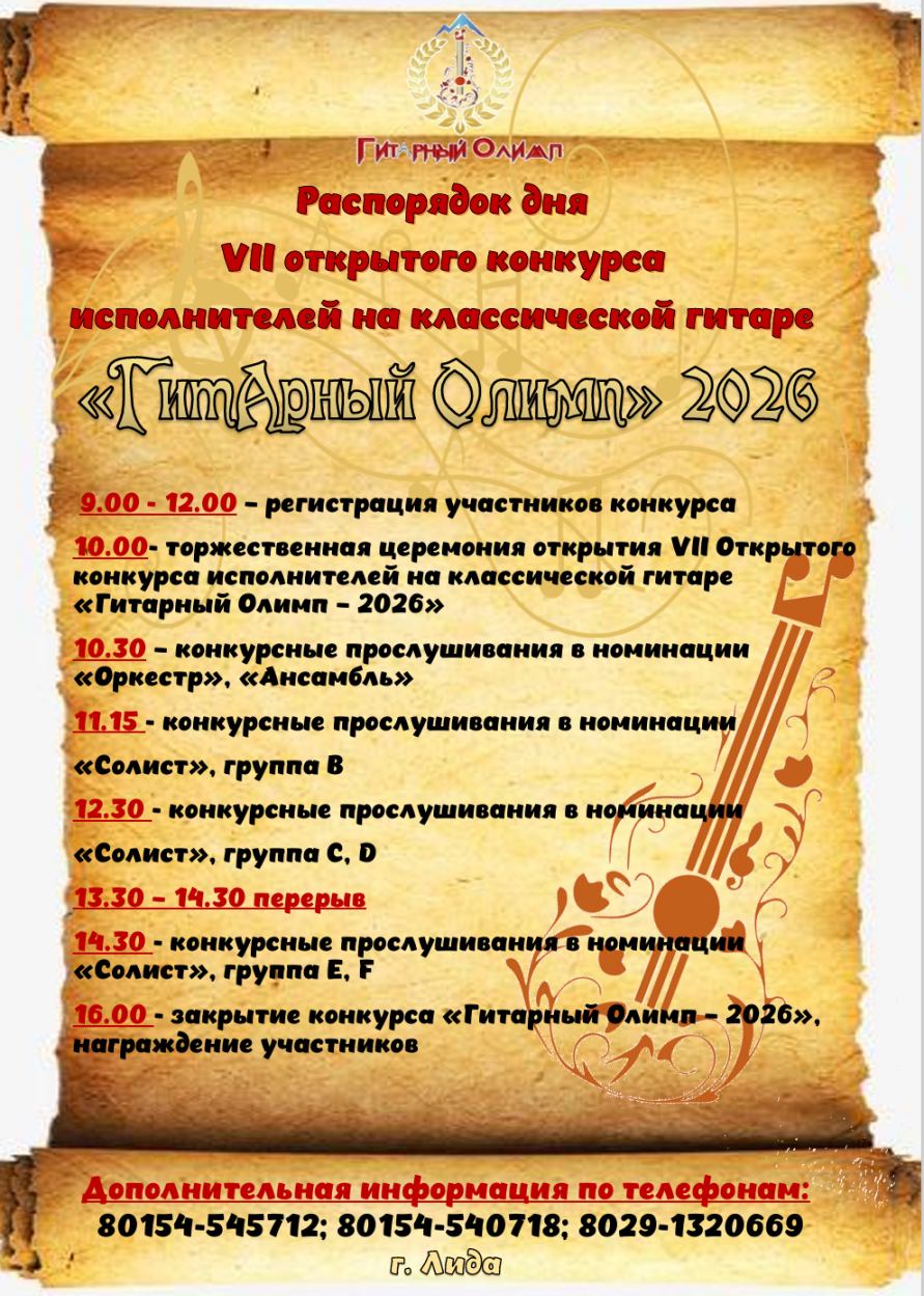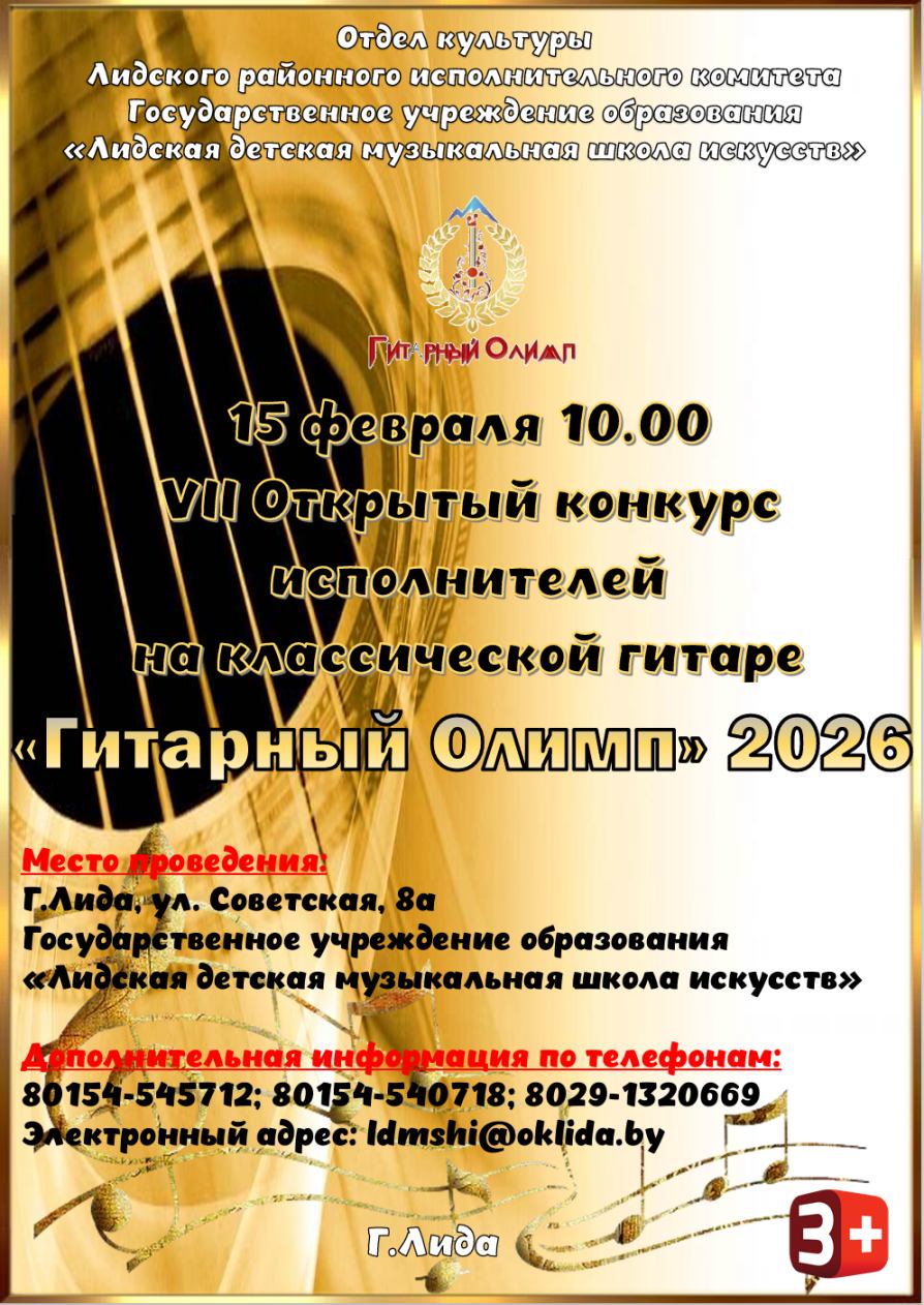 VII открытый конкурс исполнителей на классической гитаре «Гитарный Олимп» пройдет в Лидской детской музыкальной школе искусств 15 февраля 2026 года, начало торжественного открытия конкурса в 10.00!